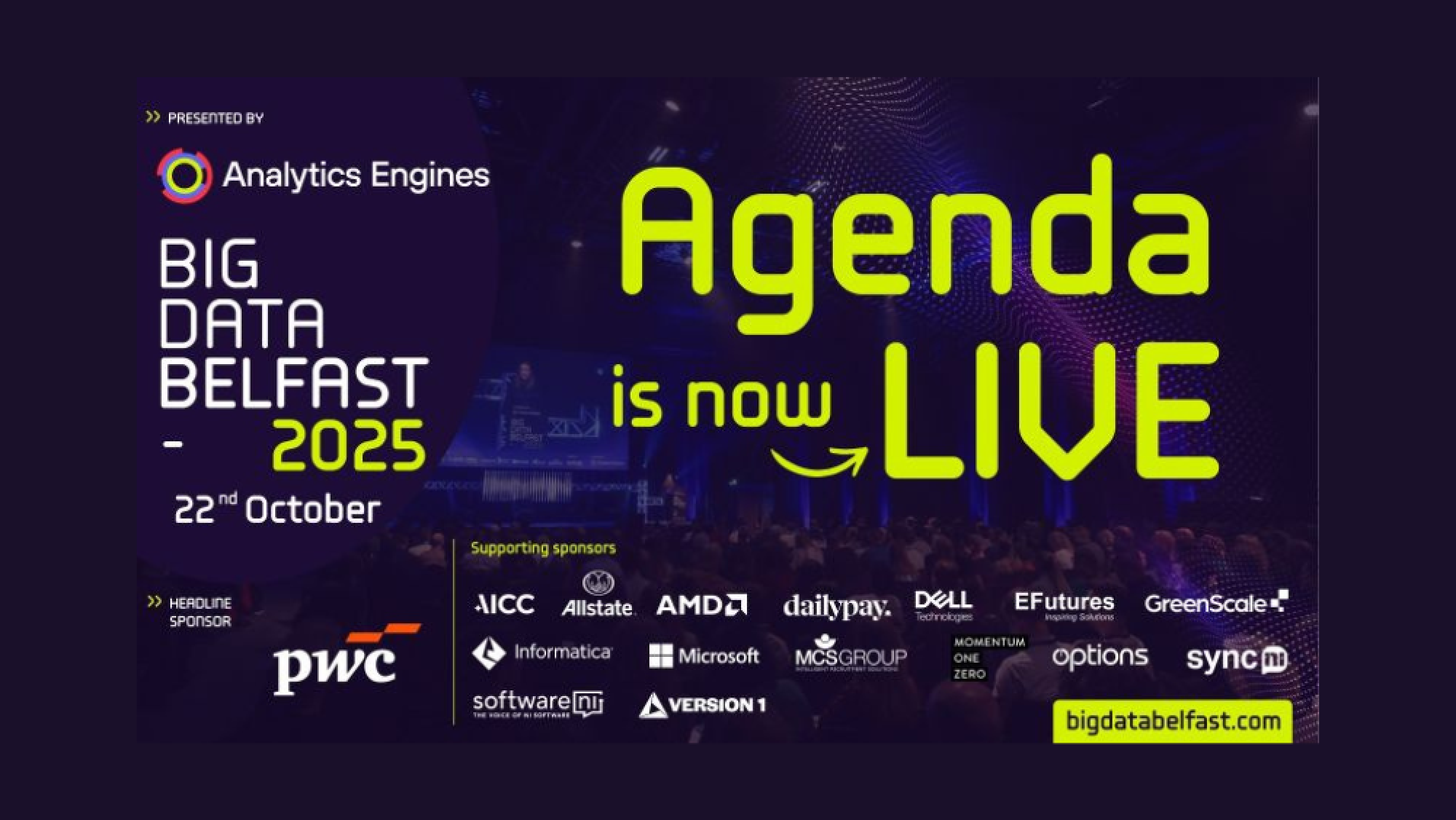 Big Data Belfast is your front- secure your seat now of analytics, artificial intelligence and digital transformation. Expect a packed agenda of keynotes, case studies and panels exploring how data is reshaping sectors including healthcare, finance, public services, manufacturing and sport.